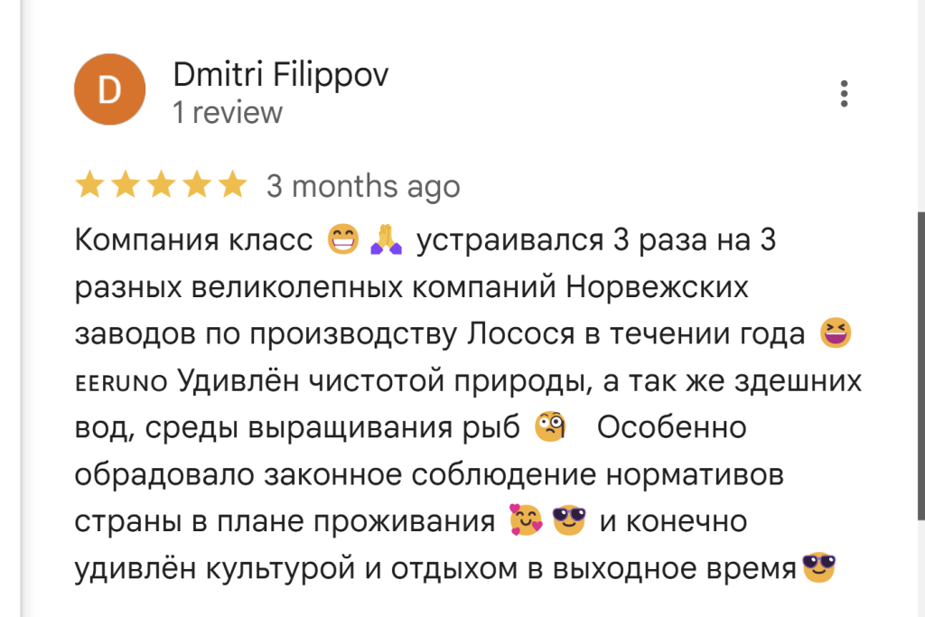 “Компания класс 😁🙏 устраивался 3 раза на 3 разных великолепных компаний Норвежских заводов по производству Лосося в течении года 😆 🇪🇪🇷🇺🇳🇴 Удивлён чистотой природы, а так же здешних вод, среды выращивания рыб 🧐 Особенно обрадовало законное соблюдение нормативов страны в плане проживания 🥰😎 и конечно удивлён культурой и отдыхом в выходное время😎”