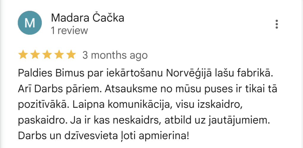 “Paldies Bimus par iekārtošanu Norvēģijā lašu fabrikā. Arī Darbs pāriem. Atsauksme no mūsu puses ir tikai tā pozitīvākā. Laipna komunikācija, visu izskaidro, paskaidro. Ja ir kas neskaidrs, atbild uz jautājumiem. Darbs un dzīvesvieta ļoti apmierina!”